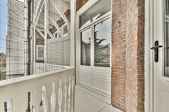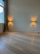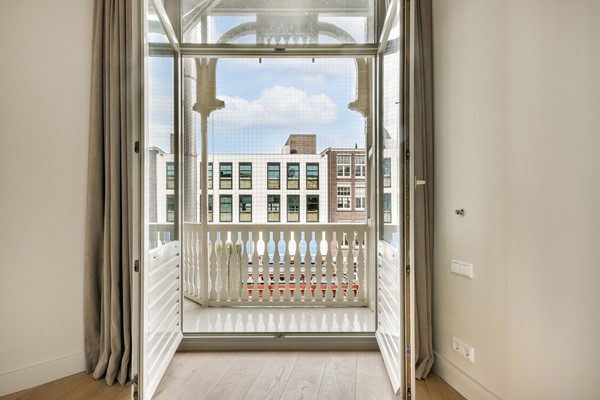 Entrance of the apartment is on the second floor. You enter the very spacious hallway where you find a cloakroom and a stylish glass and steel door leading to the living room of 45M² which has a lot of natural light due to the large windows and high ceilings (3.10 Meter). The apartment has three small balconies at the front due to the corner location. The kitchen is equipped with built-in appliances it even has a Quooker. At the backside of the apartment there are two bedrooms. The master bedroom (12M²) has direct access to the balcony and a storage room. The smaller bedroom (9M²) is perfect for a home office/walk in closet etc and also has direct access to the balcony. The bathroom has a separate bath, walk-in shower and double washbasin with design mirror. In the hallway is a separate toilet and a room with the connection for the washing machine and dryer.