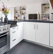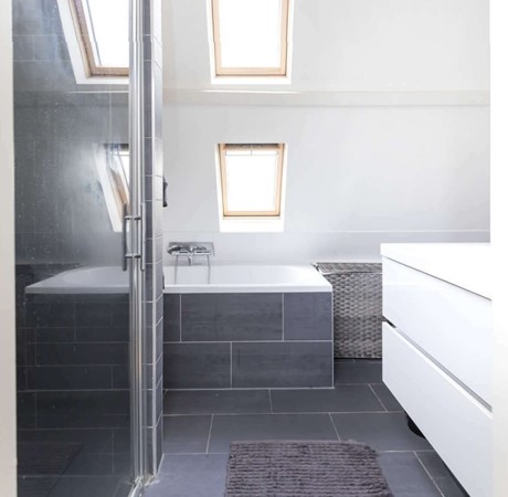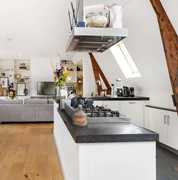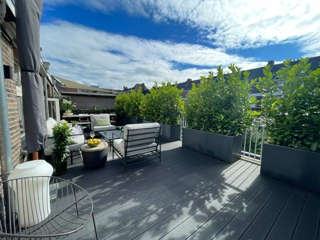 Third floor; Landing, wardrobe and spacious living room with beautiful oak wooden floor and built-in cabinets. Due to the many windows the living room is very light. French doors opening to the sunny and private terrace facing West of 35M2! Due to the plants you have complete privacy. Luxurious open kitchen equipped with all modern-day appliances such as a freezer, oven/microwave, dishwasher, five burner gas stove, large oven and extractor hood. Furthermore, a guest toilet and storage room with connection for washing machine and dryer can be found on this floor. The authentic wooden beams give an amazing contrast to the modern space.
