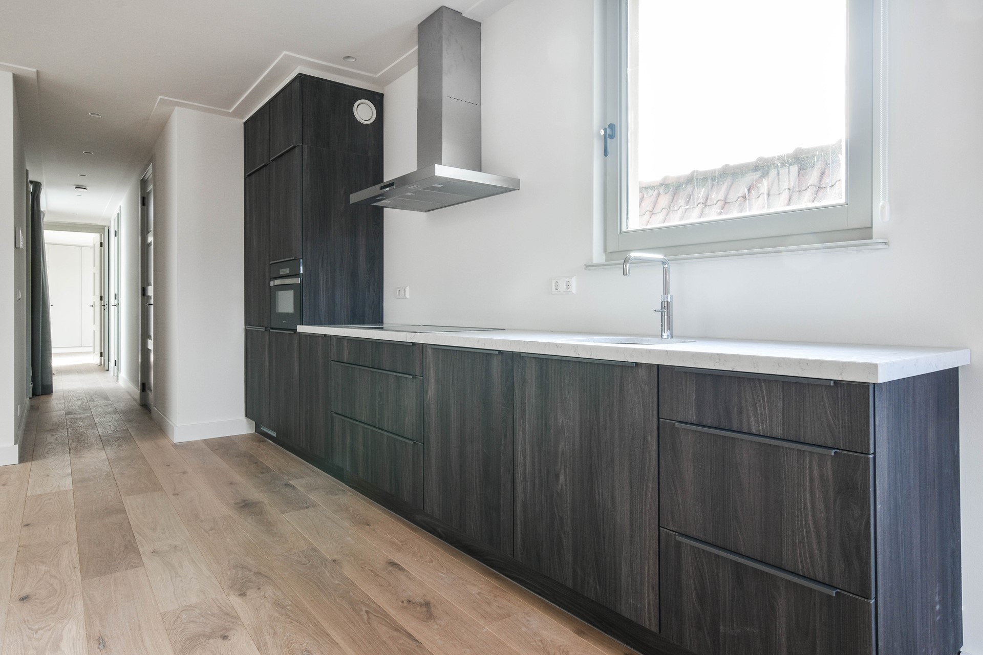 Here you enter the spacious and bright living room with open plan kitchen. View on Utrechtsestraat. The design kitchen has all equipment needed like a separate refrigerator, separate freezer, oven/microwave combination, dishwasher and a Quooker. The countertop is made of stone which gives a luxurious feeling to the kitchen. In the living room is the staircase to the roof terrace of 36m2! The roof house has a pantry with refrigerator for your convenience.