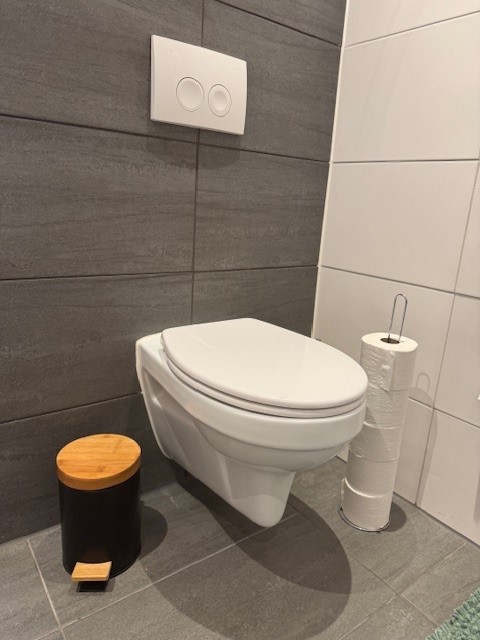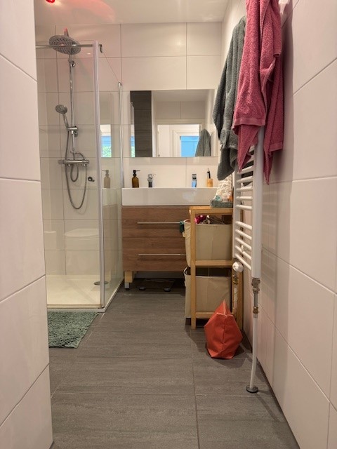 The bathroom is equipped with walk-in shower, towel radiator, toilet. It is conveniently located in the middle of the apartment.